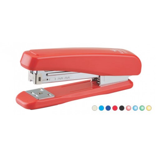 - Metal body half strip stapler with plastic casing.